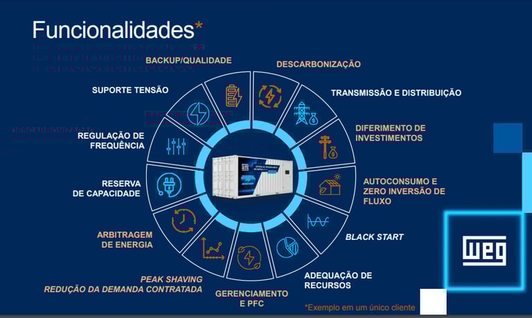 Armazenamento inteligente para eficiência energética. O sistema de armazenamento de Energia - Escala de utilidades (Utility Scale) WEG é uma solução completa para armazenamento e gerenciamento de energia elétrica que pode ser configurado para desempenhar inúmeras funções, sendo indicado principalmente para aplicações em sistemas instalados na frente do medidor.